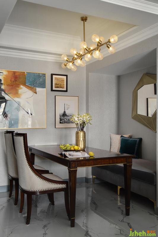 餐厅是一个独立空间,一边靠墙放置了绒布条凳,不仅可以作为餐椅,也是一处小的私密休闲区。墙上的金边不规则装饰镜,精致美观,充满时尚与立体感,美镜配美食,带给家人不尽的舒适感。现代抽象混搭组合的装饰画给餐厅也带来一份艺术气息。餐桌上放置的丁香花花艺,颜色搭配淡雅,也有对光辉人生祝福的寓意。