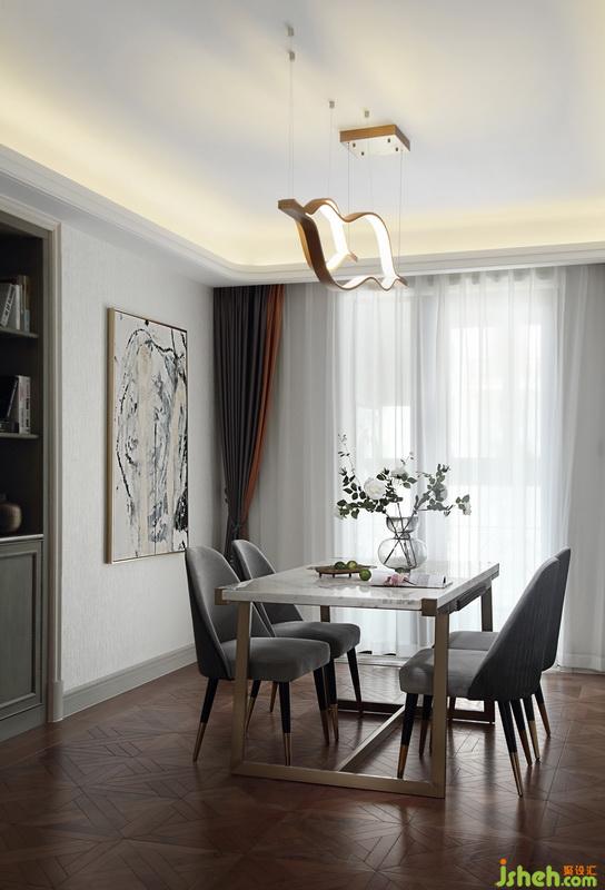餐厅室内设计师使用吊灯,吊灯犹如不规则的曲线上下波动,简约而不简单,充满艺术感,轻松塑造出家里的时髦腔调。大理石与金色结合的餐桌,显得既清爽又精致,满满的高级感。餐椅的灰黑金搭配,很显气质,可以让我们在用餐的同时感受到一丝暖意。墙面通过一副抽象画来点缀其中,可以提升屋主的品位。