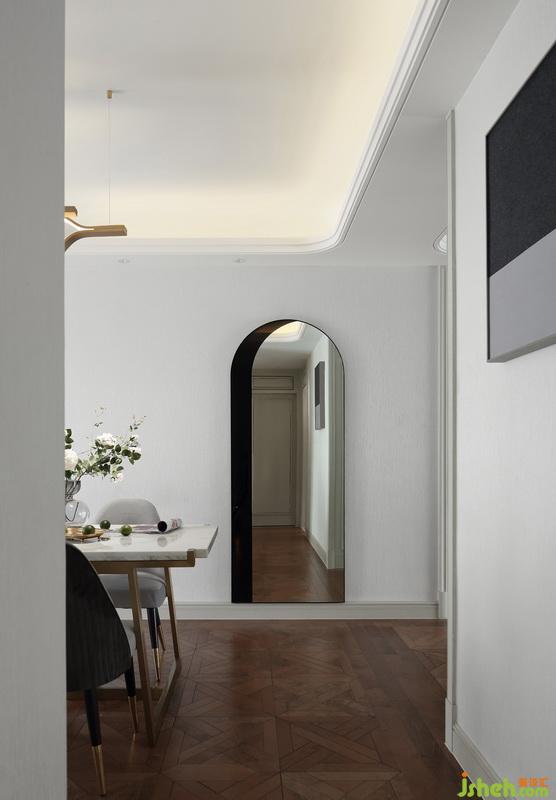 餐厅旁的拱形装饰镜造型别致,给过道增添了一份乐趣,黑色加银镜的组合,又散发出一种神秘的气质。