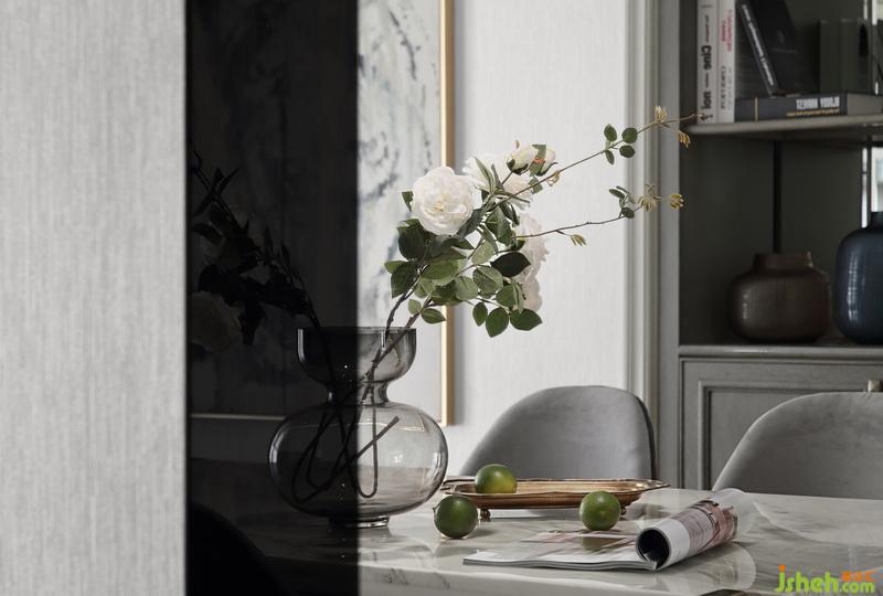 透过镜面看到餐桌上的玻璃花器,时髦的烟灰色,集美貌与质感并存,搭配几支花艺,不落俗套,优雅且有张力。