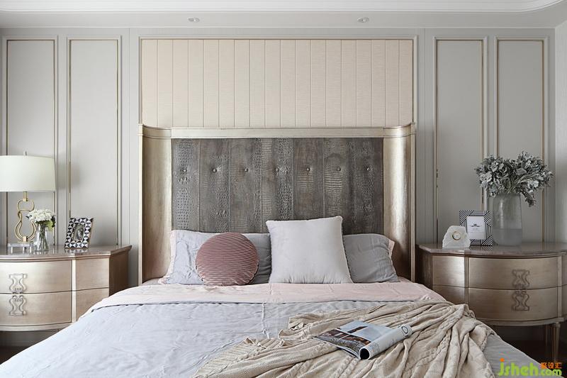 主卧的大床在色调上与背景墙相协调,耳翼造型的床头给人包围感,整体很温馨又显示出独特的时髦感。对称的床头柜色调迷人,流线型设计加上里拉琴金属拉手,既美观又实用。晶石制作的座钟简约唯美,提升了家居的格调,更像是一份艺术收藏品。床头柜上放置了银叶菊花束,寓意“收获”,一团团的像是飘散在地上的雪花一样,成为家中视觉上的一大亮点。