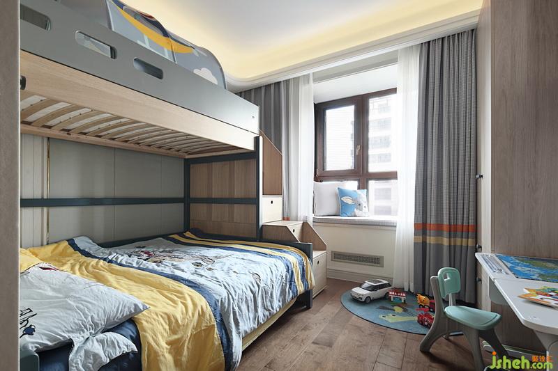 儿童房的主人是一位还在上幼儿园的男孩,上下铺的床可以给孩子构建一个快乐的小天地,陪伴孩子快乐成长,给孩子的青春童年创造一段留恋的时光。室内设计师使用卡通的床品不仅可以给孩子增添乐趣,也有助于更安心的睡眠。