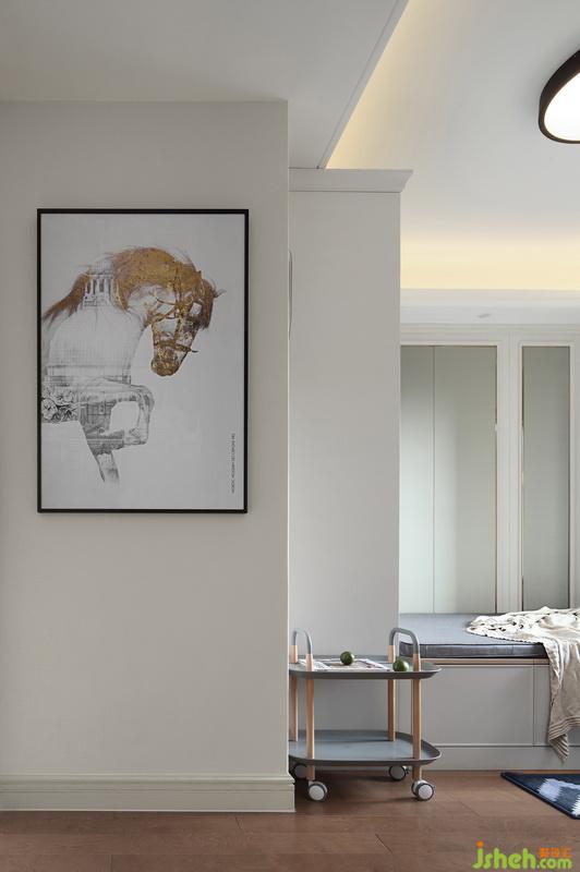 进入多功能室,一副马到成功的挂画映入眼帘,筑造了房间内的气质,为生活呈现出美好的状态。淡蓝色的置物架带有推车功能,不但颜值高,实用性也很强,又能给小朋友增添一处玩乐的意趣。