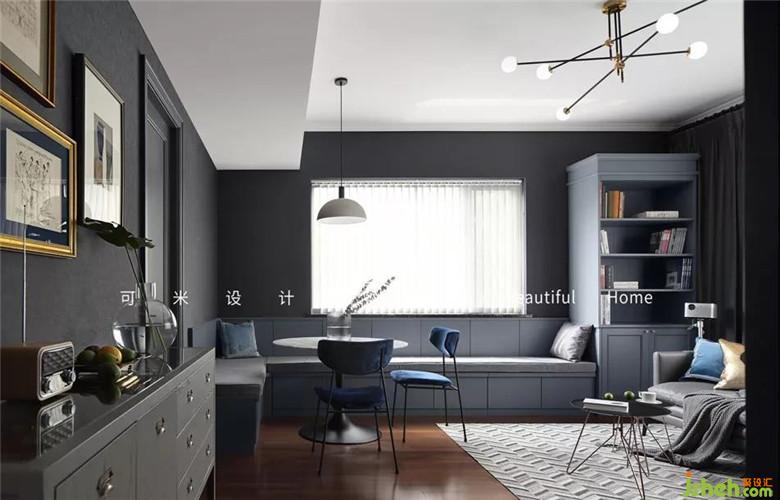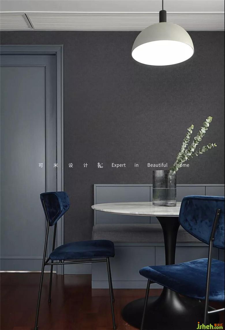 餐椅挑选了高级的宝蓝色,颜值高,坐垫是丝绒的,既有舒适性又有设计感。墙面都是贴的深灰色墙布,门和屋内柜体的颜色定制的都是灰色,保证了整屋色调的统一,搭配在一起使整屋充满高级和时髦感。