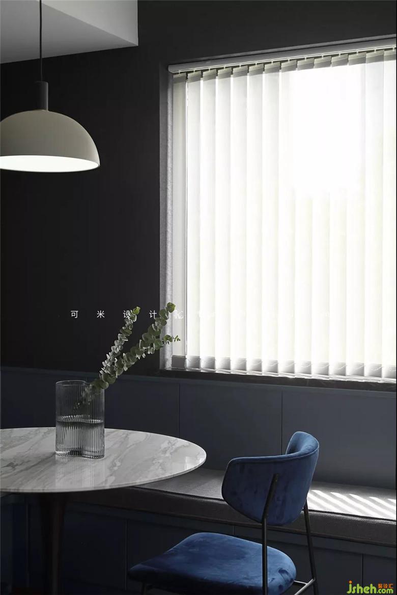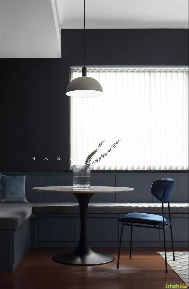 餐厅的吊灯挑选了浅灰色的圆灯罩与黑色灯柱的组合,沉稳而优雅,可以配8W到40W的灯泡。白色大理石桌面搭配黑色桌脚的餐桌,有种特别的气质,圆灯罩、圆桌面和圆桌脚刚好在一条直线上形成统一。装修公司