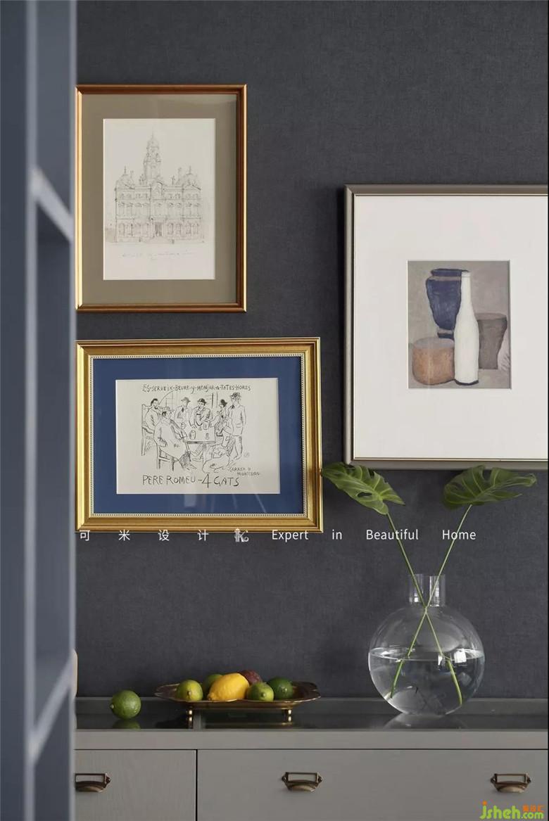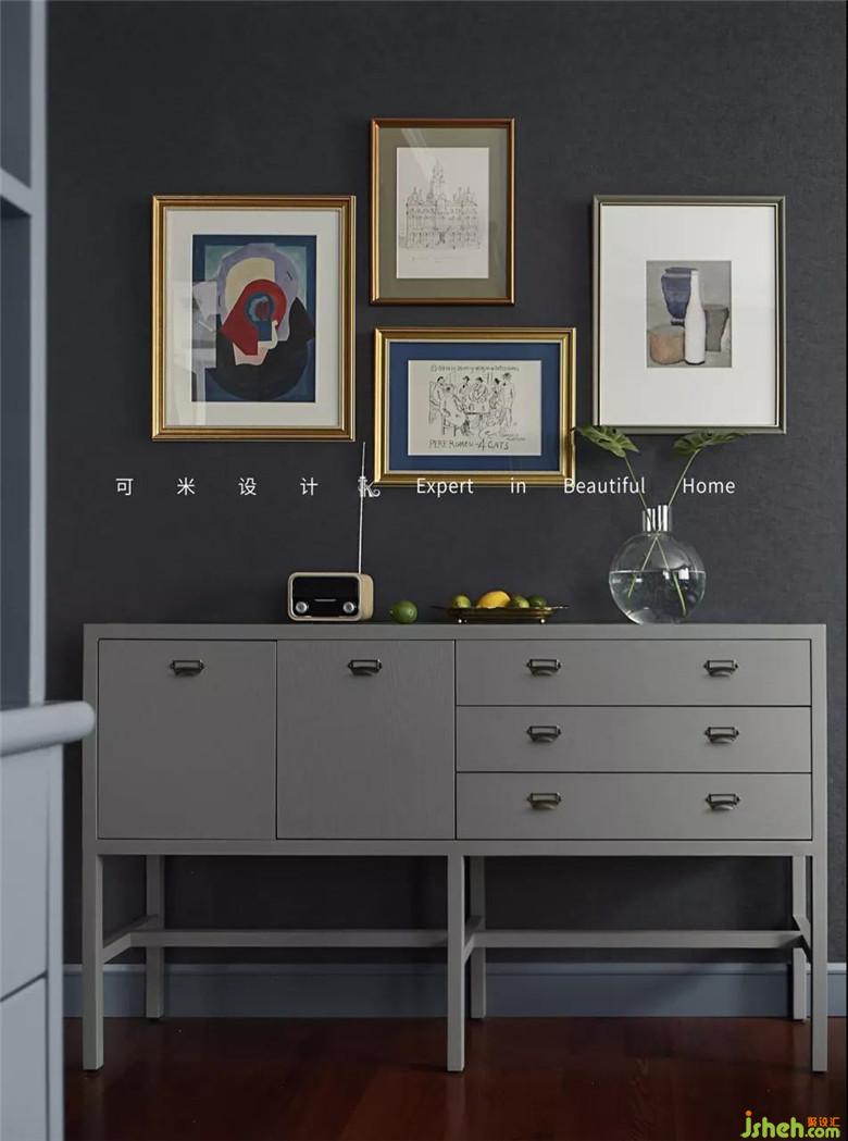 灰色的餐边柜通过挺拔纤巧的线条,严密完整的细节,向我们呈现出怀旧复古的理念。精致小巧的收音机,萌趣感十足。不同规格的几幅装饰画搭配在一起,为空间增添了文艺复古范。