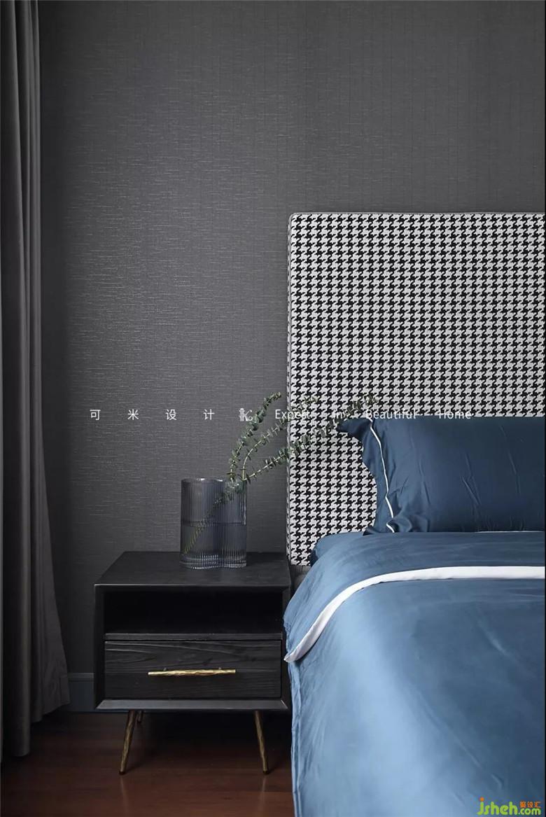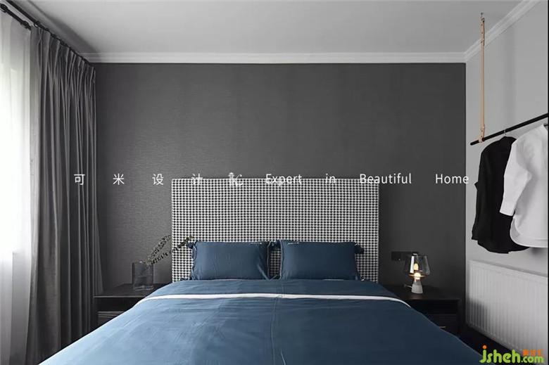 主卧的床头背景延续了客餐厅的灰色墙布,配上了千鸟格的大床,千鸟格的图案是英国贵族的最爱,散发出复古雅致的韵味,搭配上梦蓝色的床品,尽显高贵气质。房间的一侧安装了一字挂杆,长度1米,不占空间,简约美观,感受高品质的收纳体验。