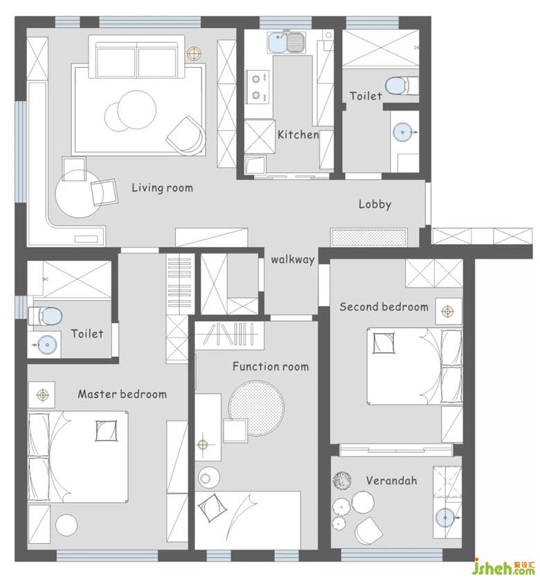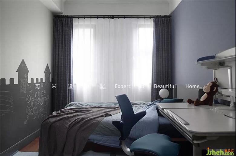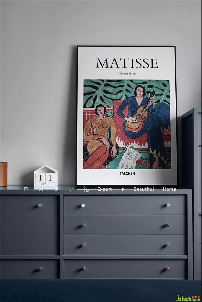 卧室的斗柜在色彩上与整屋的柜体保持一致,线条干脆利落;抽象的人物装饰画,在色彩上构成了视觉冲击,整体充满复古时尚感。台历的小摆件通过手工打造,原木制作,使我们的生活充满仪式感。装修公司