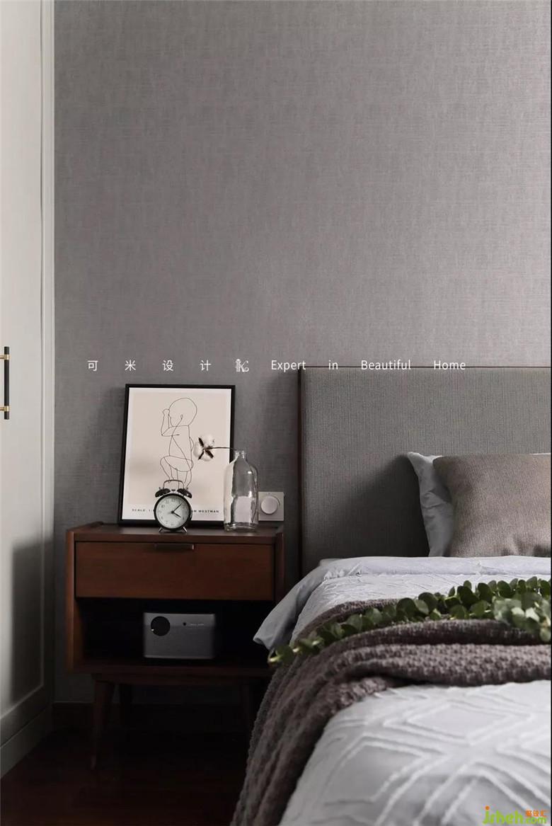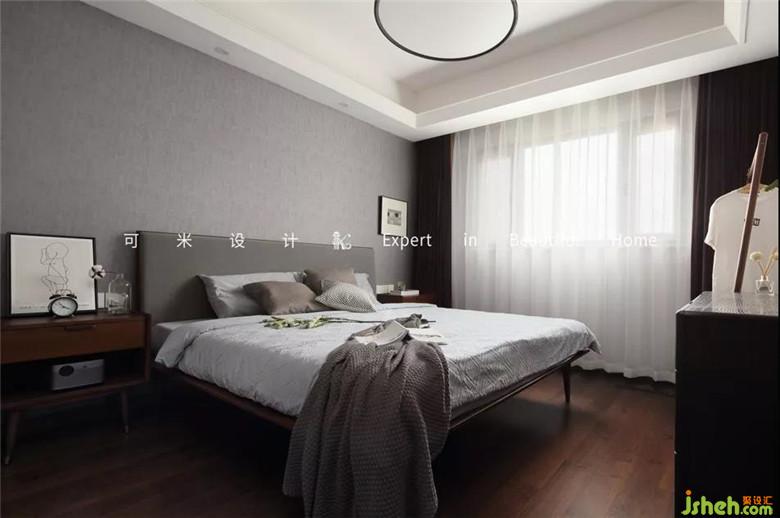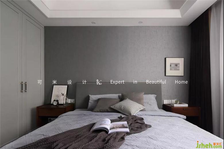 主卧的墙面贴满了灰色的墙布,搭配的大床靠背也是灰色的,与客餐厅的整体色调保持一致。当阳光透过窗户照射进卧室,可以打破屋内的暗色,产生一种明快的视觉感。