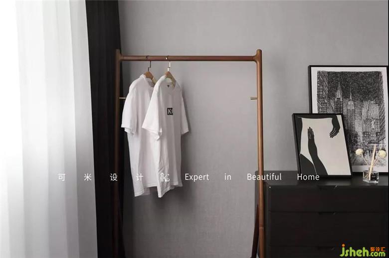 主卧一角放置了一个黑胡桃色的挂衣架,让每一件衣服归来后,都优雅从容,感受简单的美好。