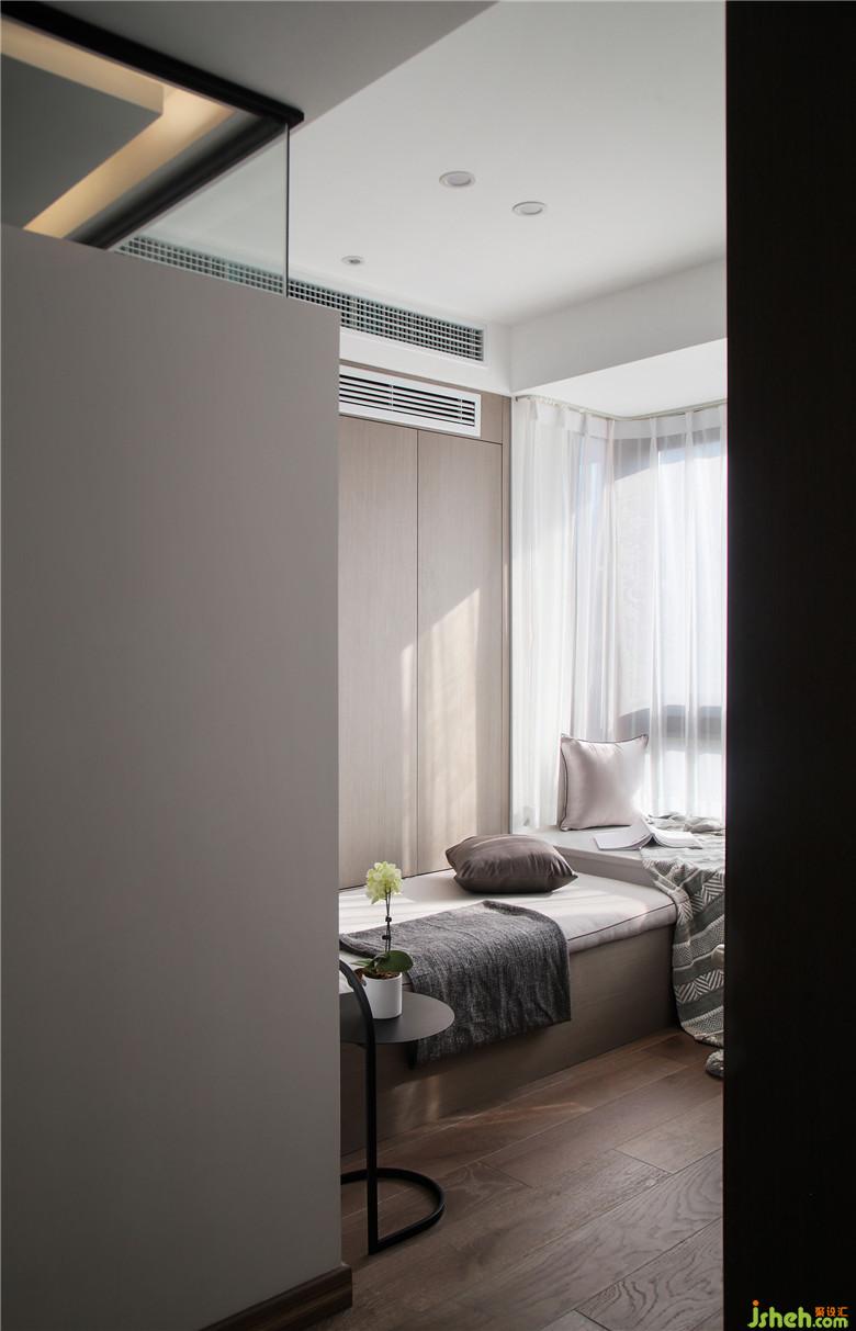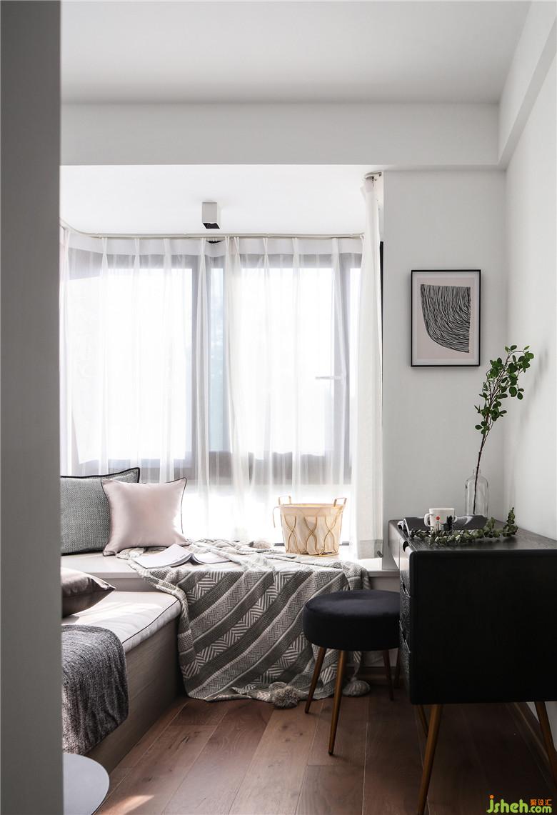 墙角装修公司选购了一套梳妆台,表面是翻盖式的镜子,内嵌储物格,合上时又可以作为书桌使用,装修公司搭配天鹅绒的圆凳,柔软舒适。窗前拥有一个大的飘窗,无论坐在桌边看书还是靠在飘窗上都可随自己的心意,悠闲而自在。
