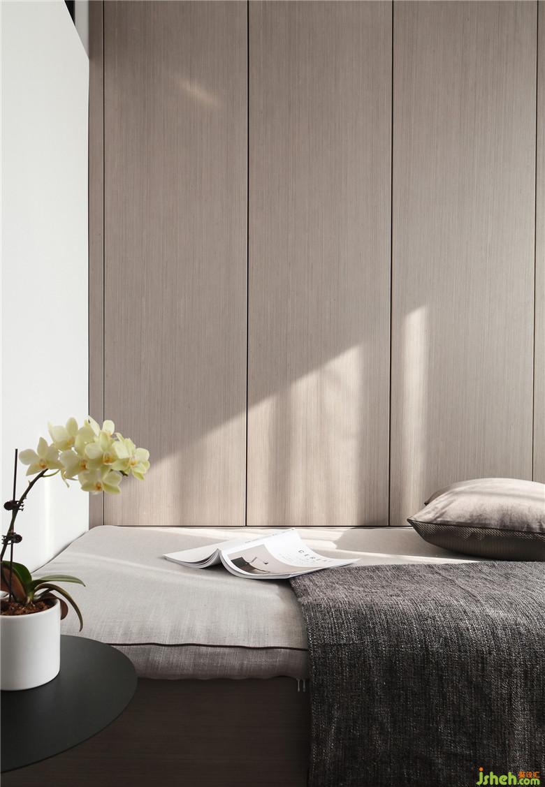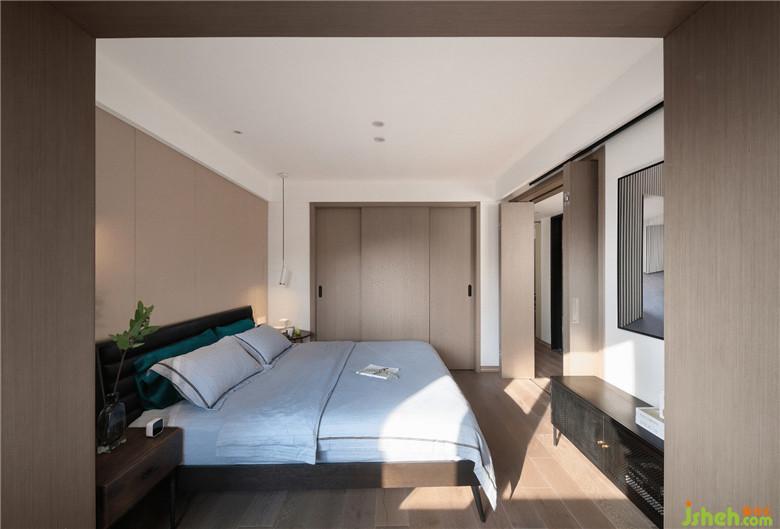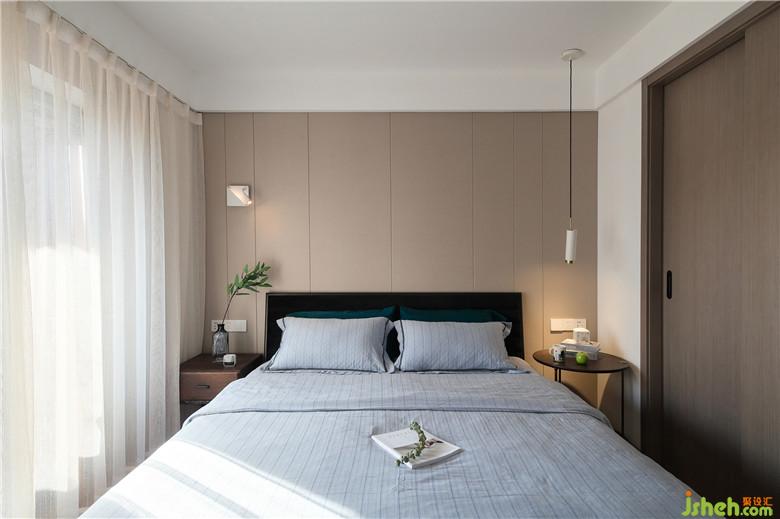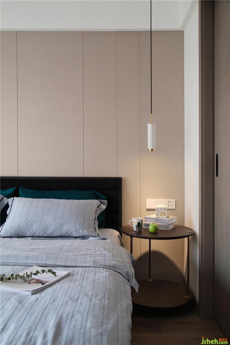 卧室的床头背景采用了浅咖灰色的硬包,简洁柔和,与整屋色调相一致。床头靠背配有黑色软包,倚靠更加舒适,搭上浅蓝色的纯棉床品,时尚且优雅,给屋主带来舒畅的睡眠体验。