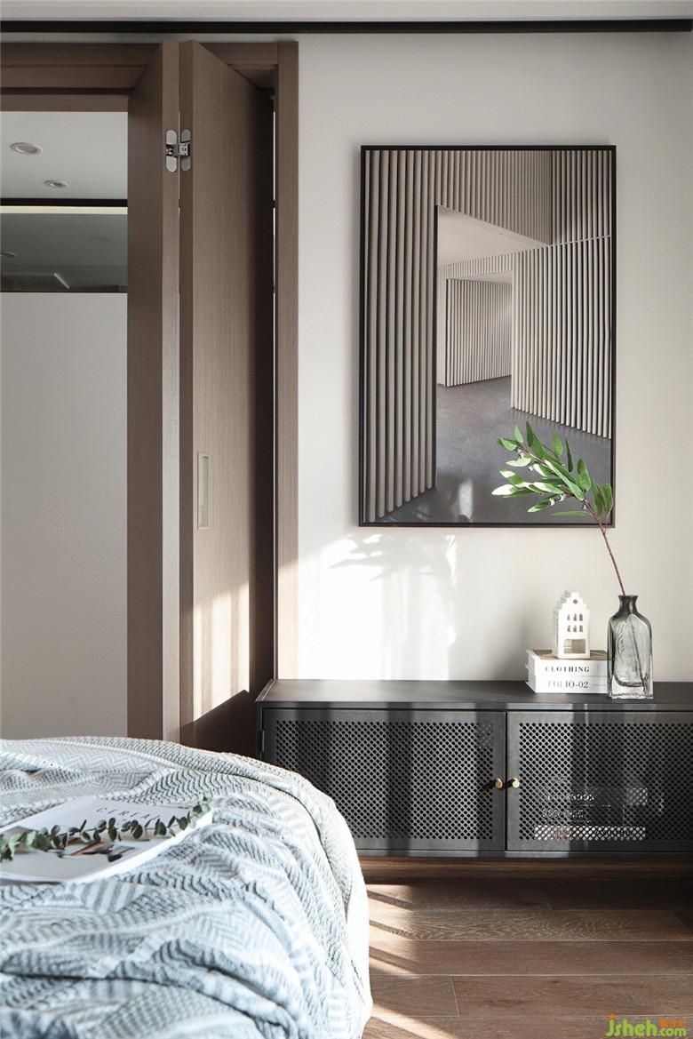 这面墙上的顶端安装了投影幕布,把卧室门关上就可以躺床上享受一段视觉盛宴,节省了放电视的空间。墙上的装饰画也提升了空间的艺术格调。