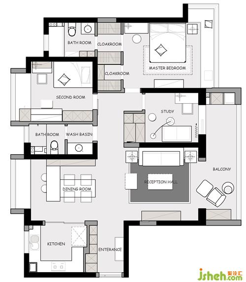 5.书房的门向内移了1.1米,使得主卧的进门可以向右平移,从而在主卧设置两个衣帽间,增加了主卧的收纳空间