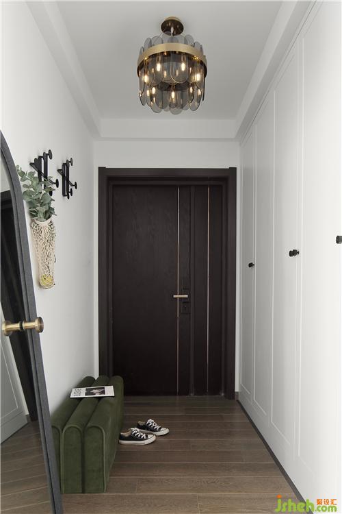 玄关处选购了一款烟灰色玻璃片与金色铁艺组合而成的吊灯,朦胧而精致。橄榄绿的换鞋凳高贵典雅,在复古中透露出时尚气息。墙壁上安装了一款几何形的挂钩,可做进门的简单收纳,也可作为一件精美的墙饰。旁边搭配了一款深灰色的拱形穿衣镜,带有一个可挂衣的把手,既实用又充满颜值。另一面墙定制了美观与实用兼具的白色玄关柜,到顶的设计,可以最大限度的增加储物空间。装修设计