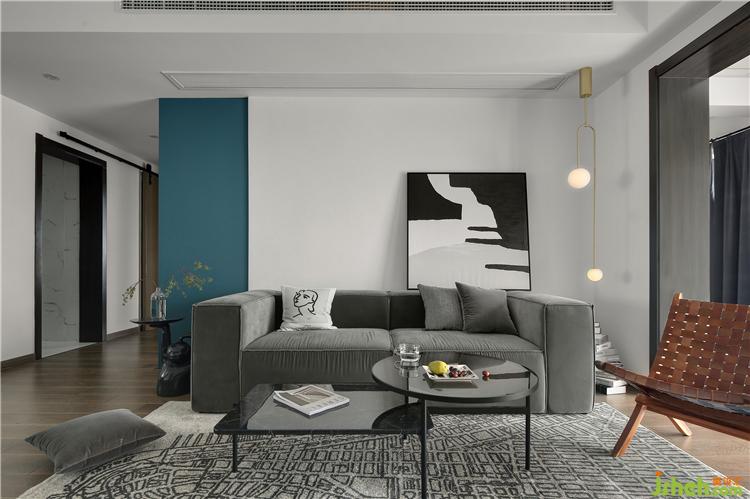 客厅选购了一款深灰色的布艺沙发,简约的造型,有种包容、大度的感觉,带来一种淡淡的美。沙发背景墙做了蓝绿色与白色的撞色,诠释了复古而精简的装饰艺术风格。一幅抽象装饰画,也为整屋增添了艺术气息。