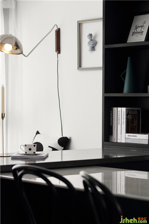 餐桌旁设置了一处黑色的吧台,闲暇时可以坐在此处品尝一杯咖啡,又可以作为餐桌的辅助功能。飘窗为我们提供了一处惬意的休闲区,得空时可以看看外面的风景,靠在此处看会书,墙上的长杆摇臂灯也为我们的夜读提供了方便。