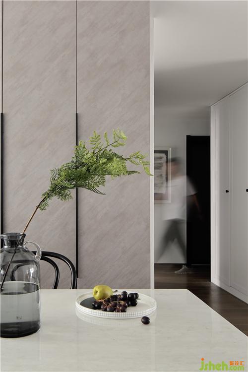 餐厅选购了一款云石桌,白色大理石桌面搭配不锈钢桌腿,摩登时尚。浅灰色的餐边柜,自带原木渐变纹理,显得安静又有质感,为空间带来温和的感觉;到顶的设计也为整屋增添了更多的收纳空间。