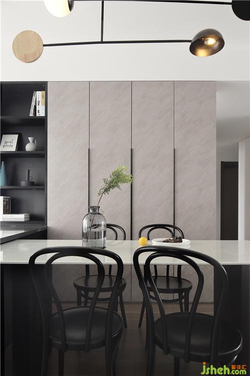 餐边柜一侧设置了一排开放式的黑色展示柜,摆放上一些书籍和几何陶瓷花瓶,为空间带来摩登的精致感。