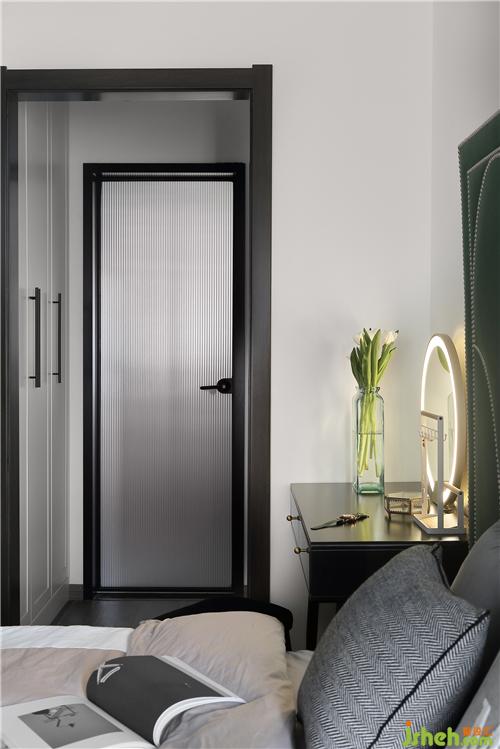 衣帽间的衣柜采用白色柜子+黑色拉手的搭配,时尚而清爽。主卫的门选用了长虹玻璃,既可以增添空间的美感,又可以保持空间的通透性;搭配上黑色的门套,又使空间多了一份高级感。装修设计