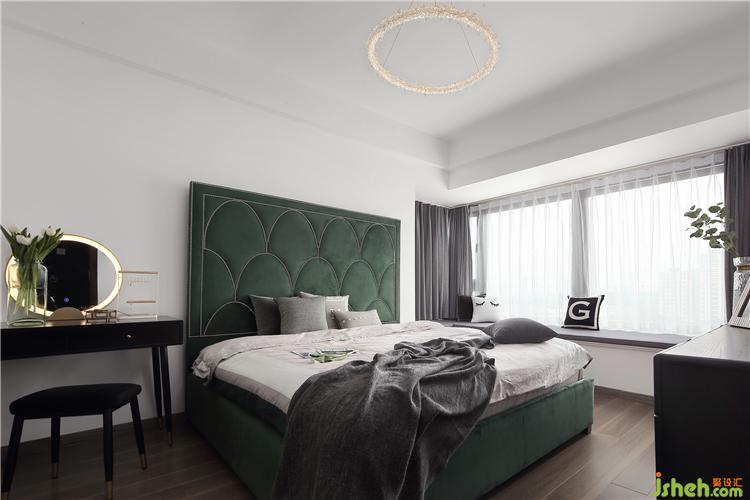 主卧定制了一款墨绿色的大床,既时髦又复古,颜值与实用性兼备,给空间带来了一丝优雅与清新。“L”型的大飘窗可以满足屋内充足的采光,也增加了一块惬意的休闲区,闲暇时可以靠在此处放空一下自己的思绪。黑与金组合而成的梳妆台,沉稳中带点浮夸,为空间带来了素雅时尚的感觉。