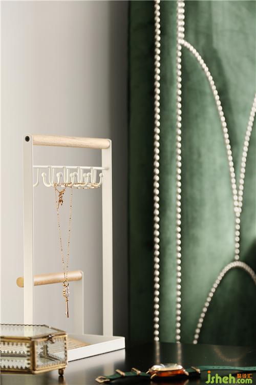 白色与原木色组合而成的首饰架,十分耐看,挂钩、木架和底部网格可以满足不同的收纳需求,成为屋内一道靓丽的风景线。