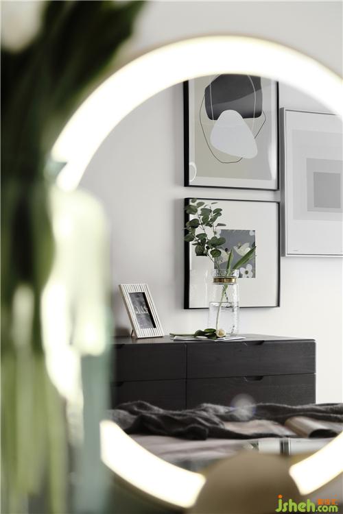 透过化妆镜可以看到主卧的斗柜,烟熏黑的柜体,沉稳而精致。墙面上的抽象画组合也给屋内带来了几分艺术气息。