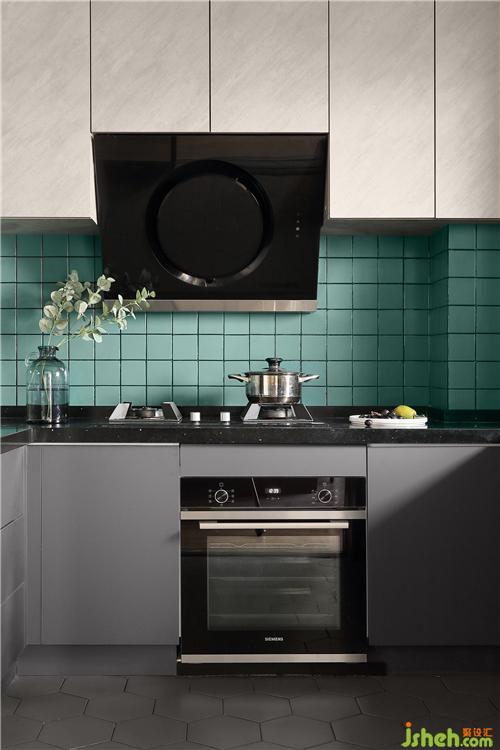 厨房的地面贴了深灰的六角砖,地柜也是定制的深灰色,带来一份暗抑之美。蓝绿色的墙砖营造出灵活泼的视觉感,彰显出清爽的魅力。吊柜与餐边柜相统一,调和整体色调,温润了整个空间。装修设计