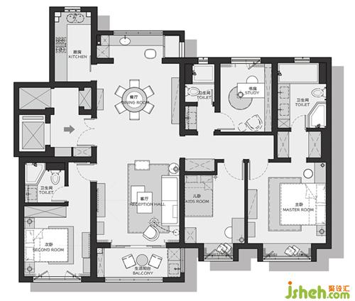 1.把朝南的三个房间分别设置为主卧、儿童房和父母房,北边的房间设置为书房
