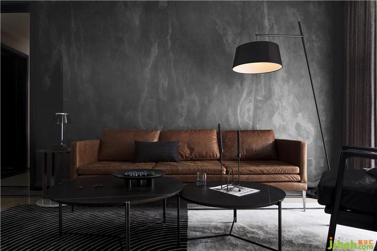 客厅的沙发背景墙铺上了一款黑色的岩板,纹理丰富多变,优雅大气,每片都是唯一独特的原石质感,可以瞬间提升屋主的品位。一款焦糖色的真皮沙发,自带暖意,与黑色背景搭配出一种潇洒与舒适,可以让我们沉浸于慵懒与闲适之中。高低错落的圆形组合茶几,增加了空间的层次感,大面积黑色点缀些许黄铜元素,带来优雅而高级的感觉。装修设计