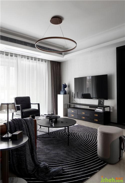 客厅地面铺设了一块黑白相间的地毯,独特的造型图案,解构空间的平凡乏味,瞬间触发出我们的艺术感官。地毯一侧放置了一款灰色的矮凳,美观便捷,带有手提功能,可随意移动,方便了我们的使用。装修设计