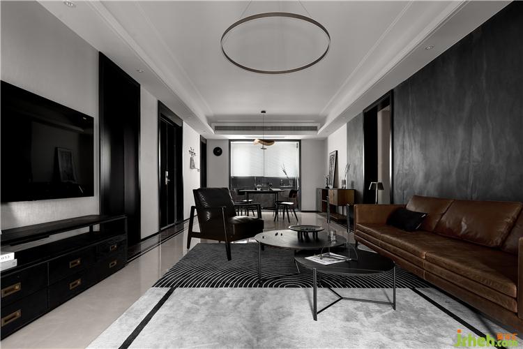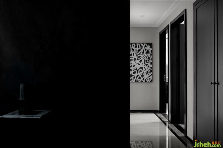过道一侧定制了黑色的储物柜,与整屋色调相统一,宽1.4米,深度60公分,可以满足屋内的收纳需求。尽头处挂了一幅黑白两色的装饰画,色块的堆积和交错,透露出别样的趣味和情调,为空间注入活力。