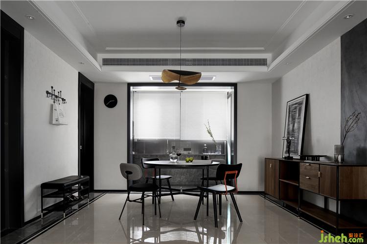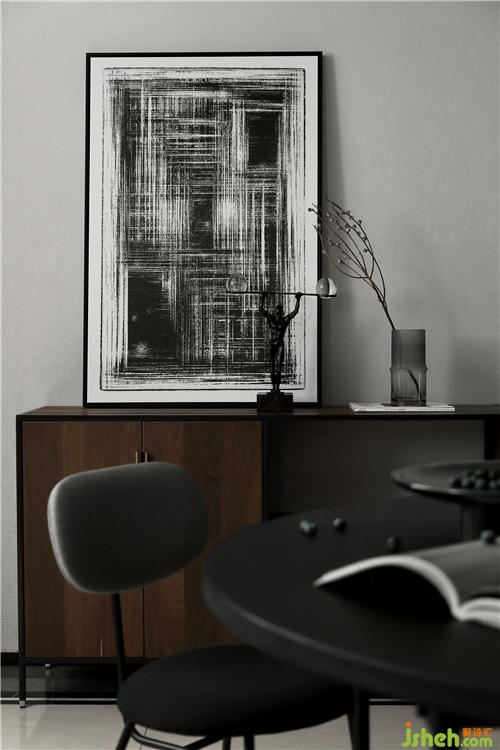 开放式与封闭式相结合的餐边柜,集展示与收纳为一身,原木色的柜子也为空间增添了暖意。一幅黑白的抽象装饰画,与整体风格相匹配,营造出空间的艺术气息。