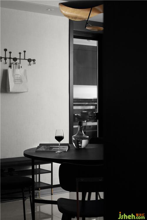 餐厅旁的墙面上装了一款黑色的圆形挂钩,可以方便进出门的简单收纳,又可作为一件精致的墙饰。地上配了一款简单的鞋架,可作为部分鞋子的收纳,由于此房为一梯一户,电梯口配有鞋柜,所以室内配上这款鞋架完全够用。