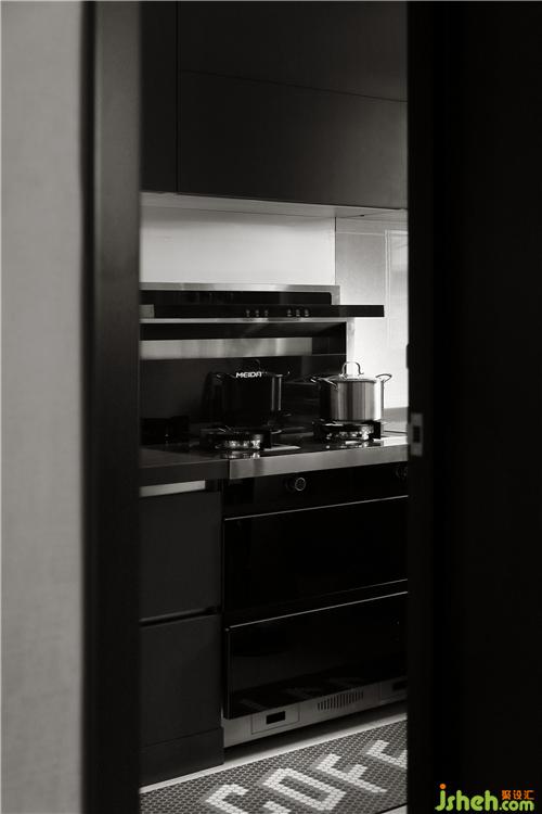 在家里,不管谁是主厨,一个充满高级感的厨房必定会让整个烹饪过程变得更有仪式感。原本厨房就是交付时的棕色橱柜,为了保证整体的设计效果,重新定制了黑色的橱柜。厨房的功能不再是过去仅仅烹饪一种功能,它还有社交、沟通等属性,所以一个带有设计感的厨房变得尤为重要。