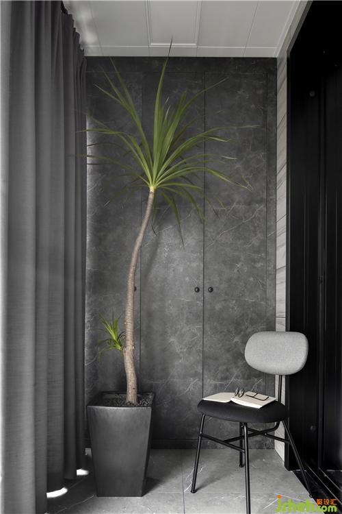 阳台定制了宽1米4,深度35公分顶天立地的储物柜,可以增加屋内的收纳空间;深灰色的柜门自带渐变纹理,气质与质感并存,又为空间带来一股朦胧感。在这里放上一盆龙血树,它植株挺拔、素雅、朴实,带有祝福长寿之意,放在室内不仅可以调节空气,还可以美化环境。