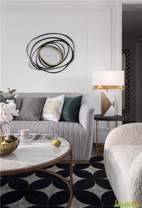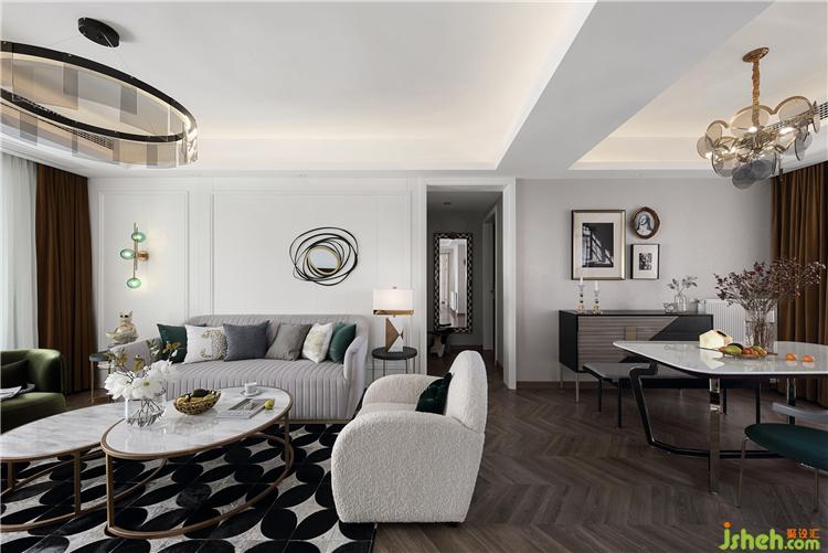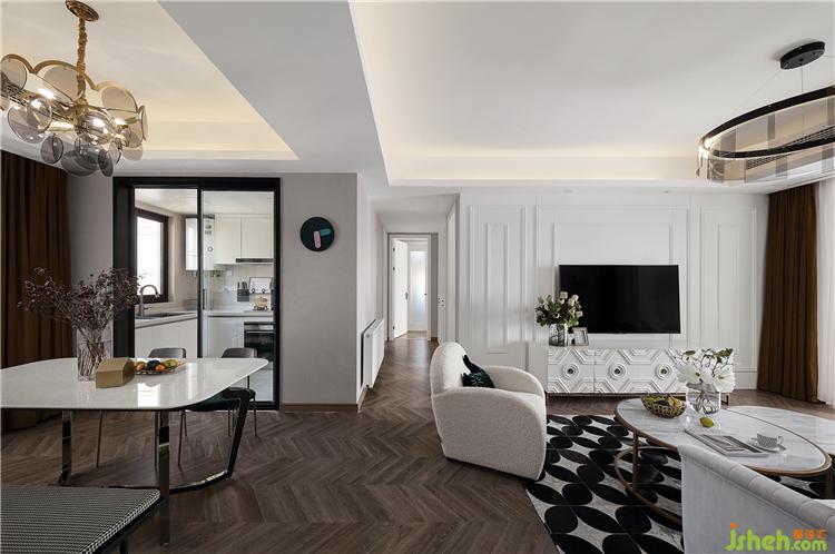 客厅与餐厅之间通过吊顶将两者划分开。整屋地面更换了咖色的鱼骨拼地板,庄重而不失雅致,为空间带来了层次感。