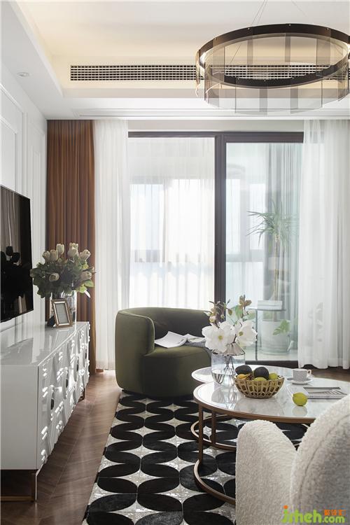 窗帘搭配了姜黄色与白纱的组合,在光线的晕染下显得明亮俏皮,带有一丝轻熟的气质,充满时髦韵味。墨绿色的休闲沙发拥有圆润的造型与舒适的坐感,尽显高贵大方,同时彰显其含蓄与内敛。