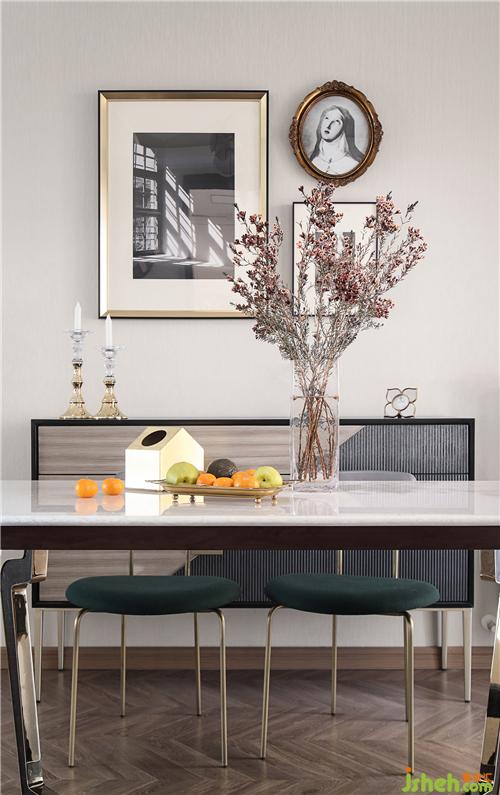 餐边柜既美观又实用,为餐厅增加了收纳空间,在上面摆放两根烛台和小的装饰物,可以装饰出更美的家居空间。墙上的装饰画为空间增添了一份复古韵味。
