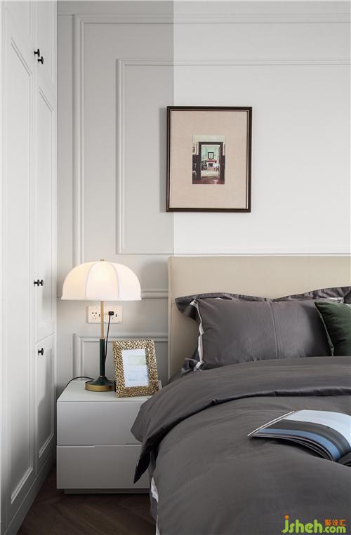 一抹绿的台灯,造型别致有格调;金色叶饰的相框,提升了屋内的档次,为整屋带来满满的精致感。