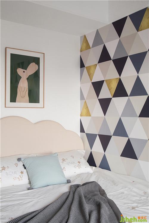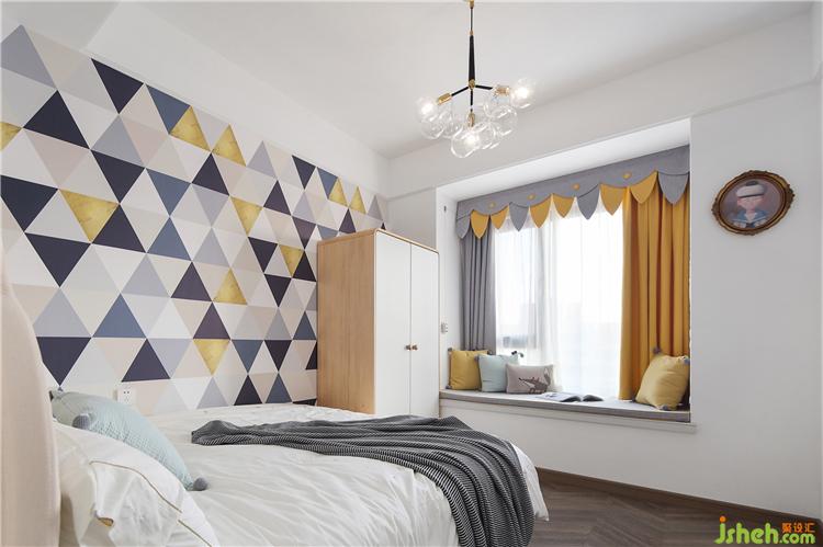 我们在一面墙上定制了多彩的壁纸,三角形+丰富的色彩,可以给孩子带来更多遐想的空间。房间内购置了一款两门衣柜,采用了弧形元素,圆润可爱,增加了屋内的收纳空间。窗帘采用灰色与黄色的搭配,瞬间提亮了空间,增强了视觉感;树叶状的造型也增加了屋内的趣味性。