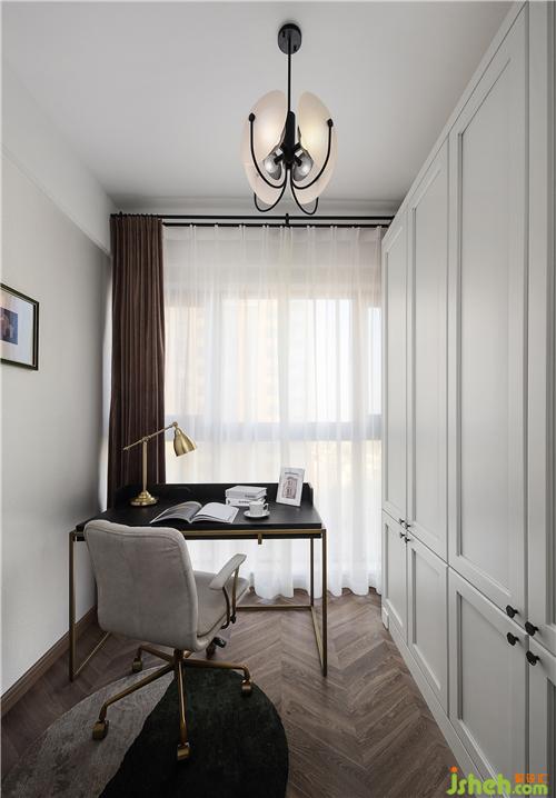 书房的一面墙定制了一排白色的柜子,与整屋色调统一,大大增加了屋内的收纳空间。书桌融合了实木与金属元素,简约大方;搭配的办公椅功能齐全,躺靠舒适,优雅大气。地上搭配的圆形地垫,为空间带来一丝暖意。