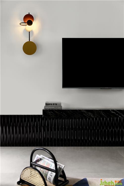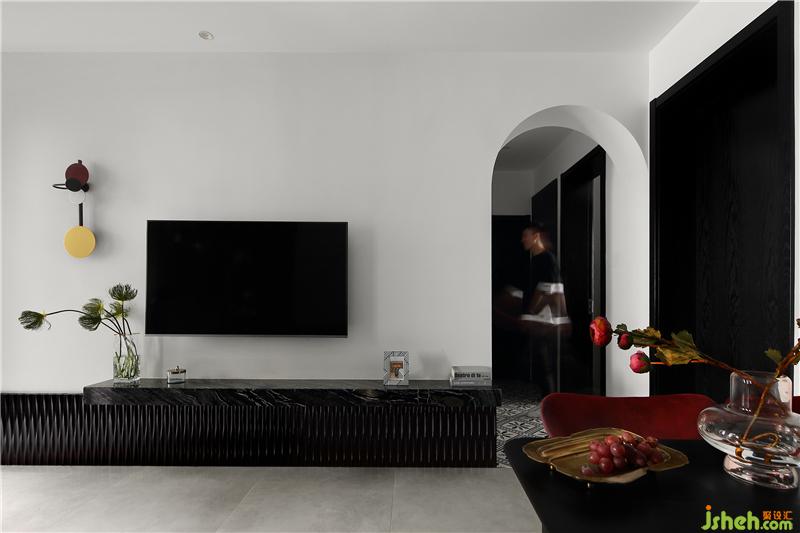 电视背景墙到门厅的墙面上安装了高度45公分的墙裙,用波浪板定制的,增加了空间的线条感与立体感,时尚美观,提升了整屋的档次。嵌在墙上的黑色花纹大理石,悬空设计看起来十分轻盈,这样的电视柜简约又显得高级感十足,提高了空间的利用率,散发出别具一格的大气与内敛。室内设计师