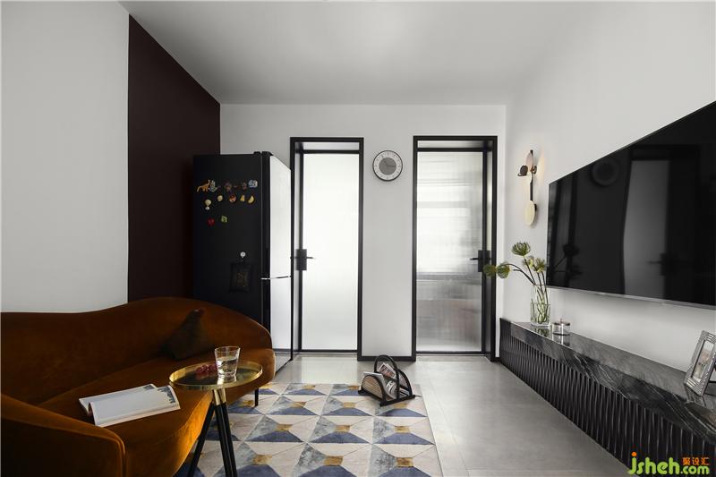 地面配上一块多彩的几何地毯,使得整个空间更加温暖,充满格调。地毯一角放上一款轻巧的藤编杂志架,收纳几本爱看的书籍,坐在此处吃点水果零食,也是特别惬意的。厨房和卫生间的门都安装了长虹玻璃,自带朦胧效果,视觉上可以起到延伸的效果,又可以优化室内的采光,令空间更显通透。