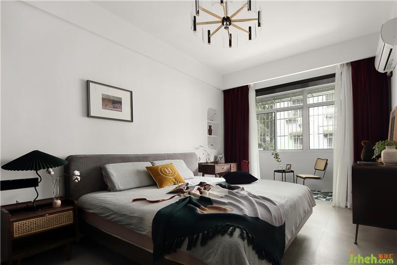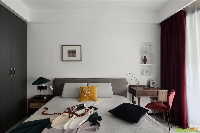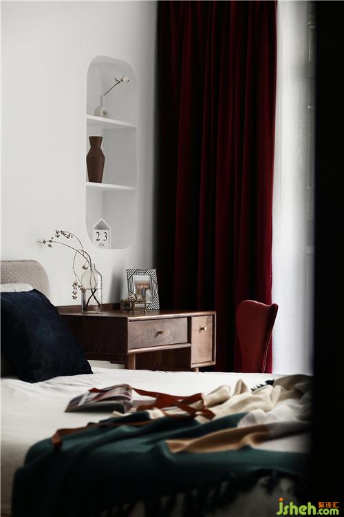 床头背景墙设计了一处壁龛,配合两块隔板,可形式一定的收纳。壁龛洞的外沿四周,似有画框的感觉,在洞内放置上陶制的小花瓶,衬托出一种意境之美。搭配上酒红色的窗帘,柔和的光线打破了它的沉闷,带来一丝雅致与清新,更显酒红的质感。