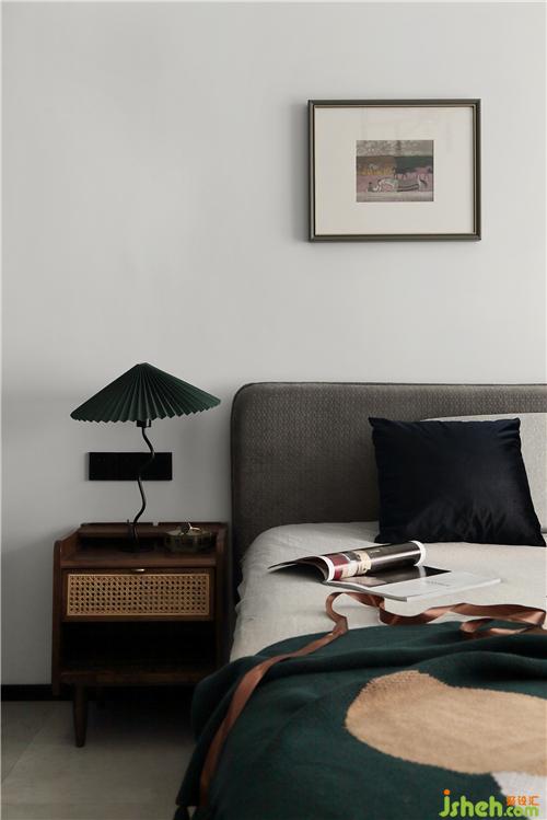 床头柜带有时髦又经典的复古调调,藤面编织的柜面更加耐看,颜值与实用兼具。伞状的台灯,线条灵动,充满设计感,墨绿色又给卧室带来了一份温情与羞涩。