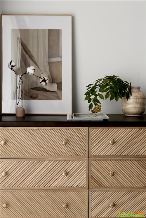 主卧一角购置了一件摩卡色的六斗柜,自然美观,安静而温馨;摆放上一幅装饰画,再配以插花和绿植,就成为了卧室里的美丽一角了。