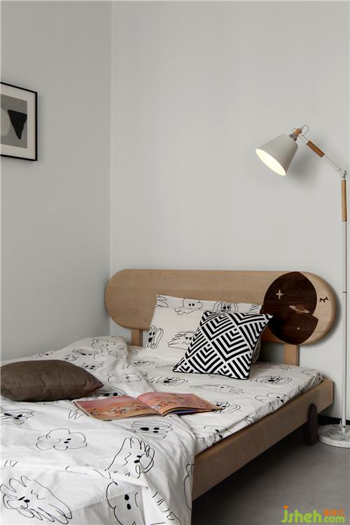 儿童床选购了一款带有圆角床头的实木床,保证环保性的同时也可防止孩子的磕碰,带有卡通图案,床脚也是轮子状的,为儿童空间带来了趣味性。木艺、金属与大理石组合的落地灯,简约的设计给人一种宁静平和的感觉,营造的不仅是光照的氛围,更能让人感受到与空间相呼应所带来的美感。