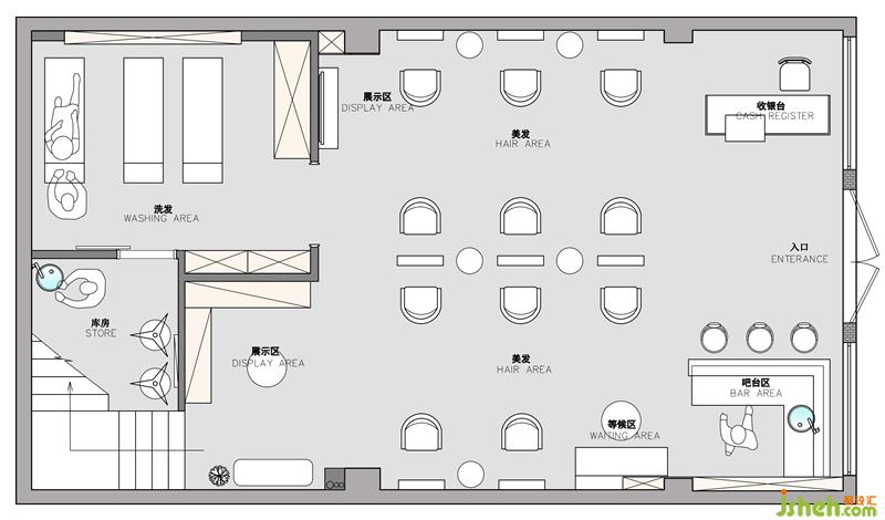 2.二楼一上来的位置设置为美发区与休息区,新建了几处墙体,分别设置了三间美容美体包间、库房、洗发区和卫生间。美发店设计