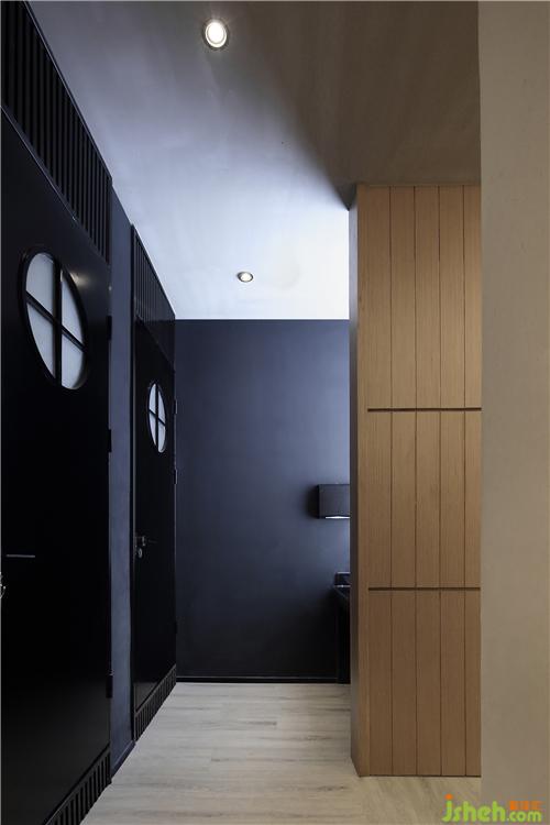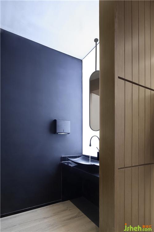 干湿分离的卫生间,配色上选用高级黑,定制的门上点缀简单的造型,兼具质感与时髦感。